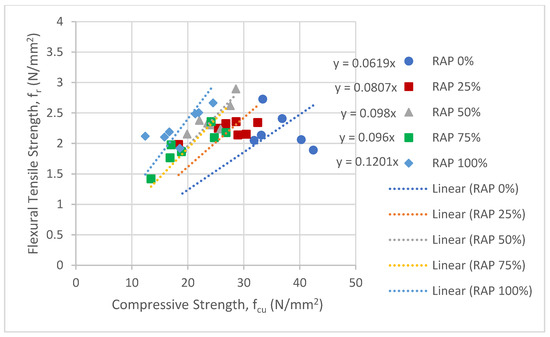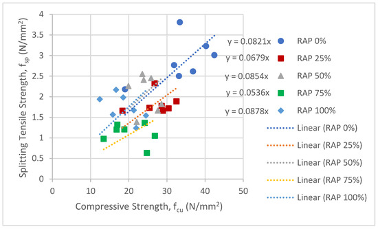 Table 8 shows the experimental test results of the hardened concretes. Each test result represents the average of three replicates. The symbols in the table are fcu: compressive strength of cub (N/mm2), fsp: splitting tensile strength (N/mm2), and fr: flexural strength (N/mm2). The control concretes have the symbol of (CC) next to the mix designation as shown in Table 8. RAP0-00 (CC) is the control concrete for 0% RAP series, RAP25-00 (CC) is the control concrete for 25% RAP series, and so on for other control concretes.