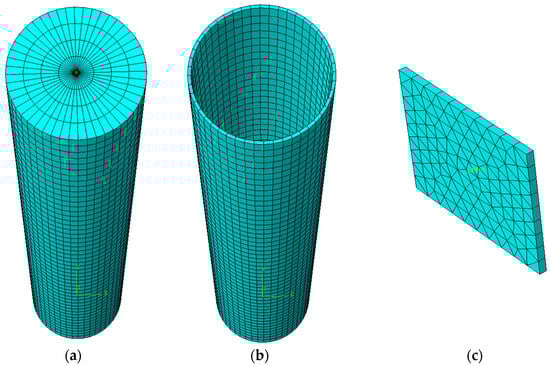 For the stress analysis, the steel tube, concrete core, and steel load plate were modeled using eight-node solid elements, specifically, C3D8R elements for the concrete core, steel tube, and steel load plate [24,25]. Each column-end node is rigidly connected to a representative point, enabling the overall movement and rotation of the cross-section while preventing relative displacements in the out-of-plane direction. The stress analysis process comprised two steps: The first step involves loading the columnar structure through a steel load plate at an ambient temperature of 20 °C. In the second step, the temperature results were introduced to the structural model as thermal loads. To read the temperature data at each node, the mesh at the cross-section of the CFT column in the structural model was kept the same as the mesh in the thermal model. Therefore, when analyzing the nonlinear stress, the temperature–time curves at the nodes were calculated from the previous thermal model.