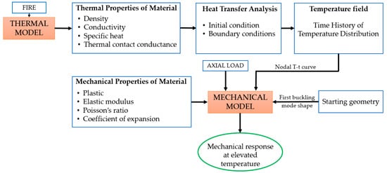 The thermal and structural behaviors of CFT columns in standard fire tests were predicted using a three-step sequentially coupled analytical approach, as shown schematically in Figure 2: Step 1—Heat load, Step 2—Heat transfer analysis, and Step 3—Stress analysis. The advantages of the sequentially coupled analysis procedure are that it is more efficient in terms of calculations, simpler, and less time consuming [24,25].
