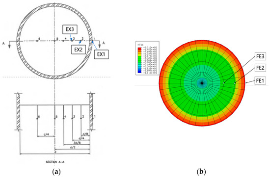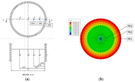 Locations of temperature gauges on the cross-sections of columns C−13 and C−17: (a) experimentation [16]; (b) finite element model.