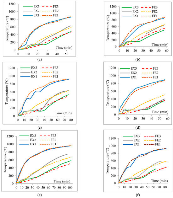 The structures under fire conditions were analyzed once the temperature on the surface of the structure over time had been determined based on the fire source. The relationship between the temperature and the time engulfed in the fire was established according to the standard temperature of the ASTM E119-88 curve [29]. These values were input into the simulation. The thermal model results were collected at the locations corresponding to the cross-sectional positions of the CFT column, as measured during the experiment [16]. The model was meshed in detail to determine its positions in the thermal model. Figure 5 shows comparisons of the predicted temperatures with those obtained from the fire tests. In these figures, some of the symbols used in the temperature–time curves are as follows: EX1, EX2, and EX3 are the measured temperatures in the CFT columns at positions 1, 2, and 3, respectively, as reported by Lie and Chabot [16]. FE1, FE2, and FE3 are temperatures determined using the finite element model, corresponding to the experimentally determined locations, as shown in Figure 3 and Figure 4.