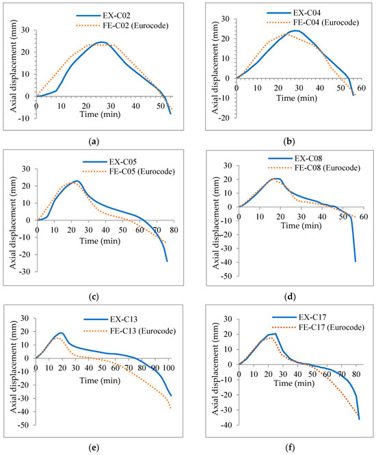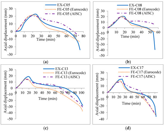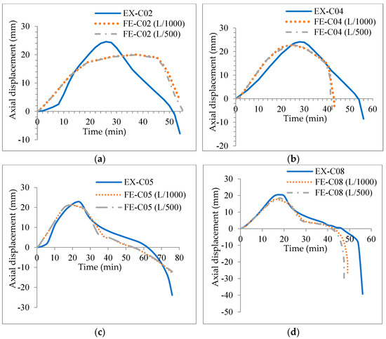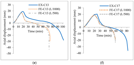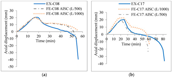 The experimental fire resistance time of the C-17 column [16] was 82 min (Figure 10b). However, the predicted fire resistance times of columns with L/1000 and L/500 as imperfection factors were 60.9 min and 58.7 min, respectively. These results show some differences from the experimental results obtained using these imperfect elements.