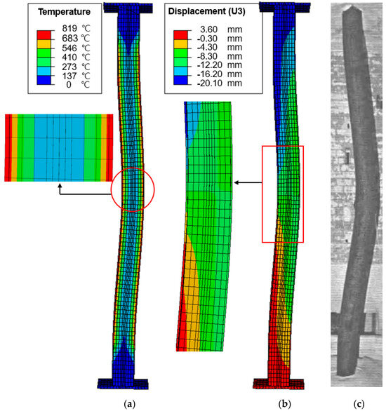 The deformed shapes of column C−17 after fire exposure, considering an initial geometric imperfection of L/500: (a) temperature model; (b) axial displacement model; (c) experimentation [16] (for material properties defined by Eurocode standards).