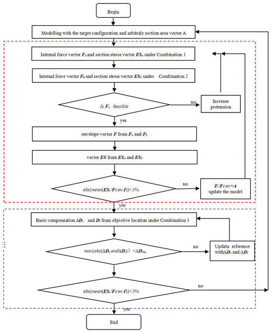 This paper divides the resolution of the pretension internal force system (also called force-finding module) and the initial configuration (also called form-finding module) into two consecutive steps. The design flow is shown in Figure 1 in which force-finding module is enclosed by red dotted line.and another blue line.