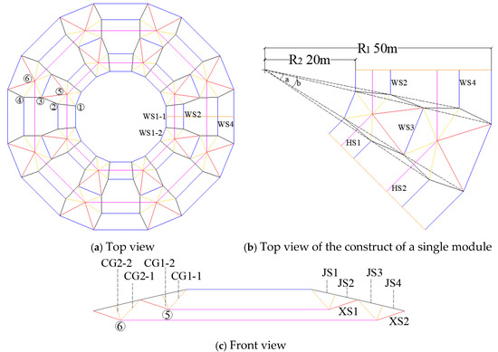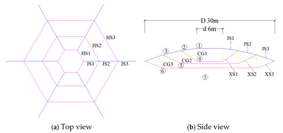 Academician Dong Shilin proposed the open-type bulged honeycomb four-strut Type III cable dome structure, which has distinct features among the numerous new cable dome systems that have emerged in recent years. This structure is statically indeterminate. The example structure has an outer diameter of 100 m (Figure 2) and an inner diameter of 40 m. It features a 16-sided, double-layered ring cable with radii of 27 m and 42.5 m, and a thickness-span ratio of 1/20. Geometrically, it is divided into eight symmetrical modules, each with a circumferential angle of 1/8 of a circle (i.e., 45°). Within a single module, the internal honeycomb angle a is 13.5°, and the external angle b is 22.5°, which are 0.3 and 0.5 times the 45° sector, respectively. The aforementioned dimensions are also the target shape of this case study, with the initial finite element model established based on this shape. In Figure 2, HS1/HS2 represent different ring cables at the lower level and WS1/WS2/WS3/WS4 represent circumferential stabilizing cables at the upper level. XS1/XS2 represent inner and outer radial inclined cable respectively and JS1/JS2/JS3/JS4 represent different radial ridge cables while CG1-1/CG1-2/CG2-1/CG2-2 represent bar stays.