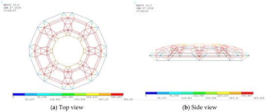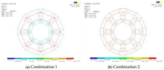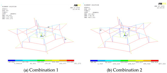 The force-finding module computation is performed first. As can be seen from Table 2 above, after three iterations the maximum stresses (ES4) in the cable and strut elements are around 400 MPa and −50 MPa, respectively, with the design target value reduced to 0.47%, which is below the limit value of 5%. Consequently, the operation of the force-finding module is ceased. The cross-sectional areas of the components are as shown in column A4 of Table 2, with the corresponding prestressed state component stresses and internal forces displayed in the last two columns of the table. By applying the negative thermal load obtained from the final iteration step (corresponding to a pretension force of 1722 kN) to the outer inclined cable XS2, stress distribution contour maps under two combinations are obtained (Figure 3). These maps show complete agreement with the corresponding data in Table 2, where the inclined cables and ring cables under Combination 1, and the ridge cables and stabilizing cables under Combination 2, all have sectional stresses around the control stress of 400 MPa, indicating good economic efficiency.
