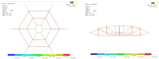 Building upon the previously defined cross-sectional areas and pretension temperature loads, the structure’s configuration under Combination 3 was validated (Figure 8).