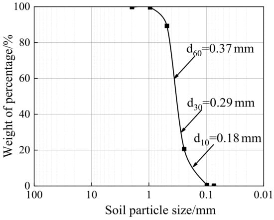 The backfill soil for the test was poorly graded medium sand with a maximum particle size of approximately 2 mm and a minimum particle size of approximately 0.075 mm. The particle size distribution curve is shown in Figure 1. Tests were conducted on the sand used following the soil testing specifications []. The main physical and mechanical property indicators of the backfill sand are listed in Table 2.