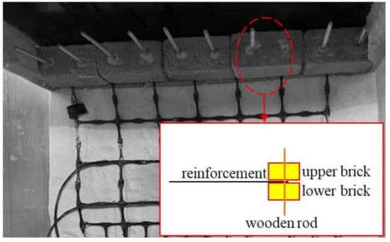 Panels are constructed by two types of brick of homemade module with the following sizes: 0.10 m (length) × 0.05 m (width) × 0.05 m (height) and 0.05 m (length) × 0.05 m (width) × 0.05 m (height). To simulate the latch process in actual engineering and strengthen the effective connection between the upper and lower layers [], a wooden rod was inserted between the upper and lower module bricks in the test, as shown in Figure 2. The reinforcement and the panel are connected not only by the friction between the upper and lower bricks but also by the limiting effect of the wooden rod.