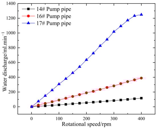 The overall rainfall simulation setup primarily consists of three parts: peristaltic pump, pump pipe, and custom-made water outlet device, as illustrated in Figure 3. Among these components, the LM60A-YZ1515X-3B peristaltic pump (which is produced by NANJING RUNZE FLUID CONTROL EQUIPMENT CO.LTD from Nanjing, China) serves as the speed control device, and the flow speed curve of different types of pump pipes is shown in Figure 4. The 17# pump pipe is selected as the water delivery tube, with a flow rate range of 2 to 1249 mL/min. The dimensions of the water outlet device are 1.05 m (length) × 0.50 m (width).