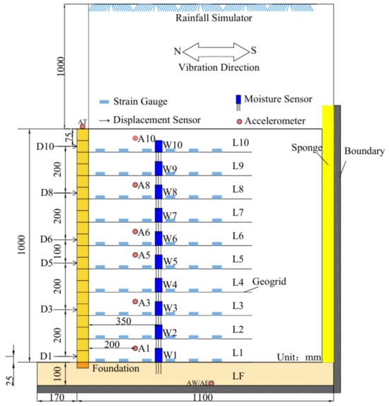 The design of the model is shown in Figure 5. The size of the test model is 1.10 m (length) × 0.50 m (width) × 1.10 m (height), and there are four types of sensors: 10 moisture sensors to monitor the moisture content of each layer of soil (it should be noted that the moisture sensor is measured by the probe needle, so 10 monitors the moisture content of L9, and so on); 6 displacement sensors to record the lateral displacement of the panel; 60 strain gauges to measure the force on each layer of reinforcement; and 7 accelerometers, with 6 buried inside the soil and 1 on top of the panel, to monitor the internal acceleration response of the structure. Additionally, to record the input acceleration, 1 accelerometer is placed on each of the east and west sides of the platform. The sponge is placed at the back of the model box to simulate real boundaries and reduce the reflection of seismic waves by the model box. LF to L10 are abbreviations for each layer of the model, where LF represents the ground layer, L1 represents the first layer, and so forth.