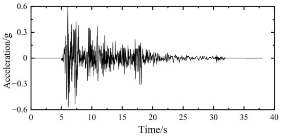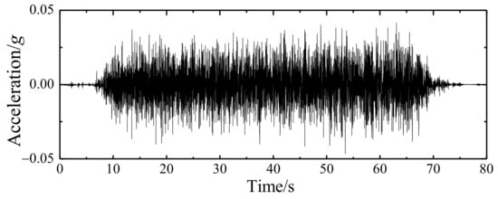 The unidirectional El Centro wave is selected as seismic excitation with a duration of 38.05 s, and its acceleration time history curve is shown in Figure 6. White noise is input before and after each seismic wave condition for frequency scanning. The duration is 80 s, and the peak acceleration is 0.05 g. The time history curve of white noise is shown in Figure 7.