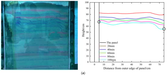 During the static settlement of rainfall, wetting fronts were drawn on the glass plate of the model box every 20 min. The coordinates of these wetting fronts were extracted and summarized at different time points to obtain the development trend graphs for the wetting fronts of each of the three working conditions, as shown in Figure 8.