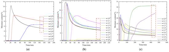 Time history curve of moisture content: (a) R1; (b) R2; (c) R3.