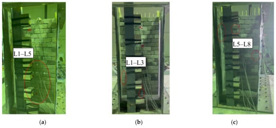 During the earthquake process, there exists minor sand leakage in the three retaining walls, accompanied by slight displacement of the panels. The overall structure remained well-preserved, demonstrating superior seismic performance, as shown in Figure 10. In particular, (1) sand leakage occurs at L1–L5 in the middle and lower part of the retaining wall panel in R1, which is almost dry sand. The reason is that rainwater exists in L7–L9, which means the backfill sands in the middle and lower part are still dry; (2) In R2, sand leakage occurs at L1–L3, the lower of the retaining wall panel, and most of them are dry sand because rainwater is distributed in L5–L9, and backfill sands of the lower part are still dry; (3) In R3, a little wet sands leak out at L5–L8 in the middle and upper part of the retaining wall panel because all layers of backfill sand were infiltrated by rain.