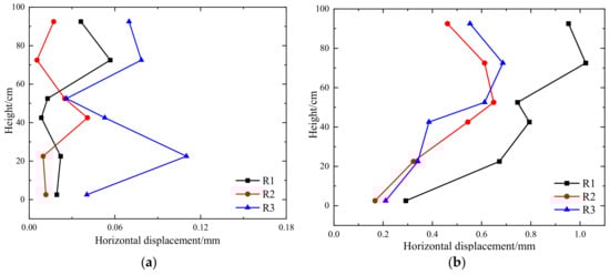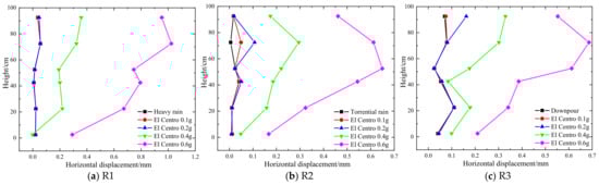 Permanent seismic displacement is a critical indicator for the design and evaluation of reinforced soil retaining walls. The deformation trend of the three groups of retaining wall panels is shown in Figure 12. The displacement of the retaining wall in the three groups of working conditions increases nonlinearly with the increase in PGA. (1) In R1, the maximum displacement of the wall appears in L8, reaching 1.02 mm; compared with rainfall load, the displacement caused by earthquake load is larger, and the peak value difference is 0.97 mm. The overall deformation is dominated by rotation and supplemented by translation. (2) The maximum displacement of the retaining wall in R2 occurs at L6, reaching 0.64 mm. The maximum difference between the displacement caused by earthquake load and that caused by rainfall load is 0.61 mm. The panel deformation is characterized by outward inclination with local bulging. (3) In R3, the peak displacement of the retaining wall appears at L8, reaching 0.68 mm. The difference in peak displacement caused by rainfall and earthquake load is 0.57 mm. The deformation of the panel is similar to that of R2, with an outward tilt mode with local bulging.