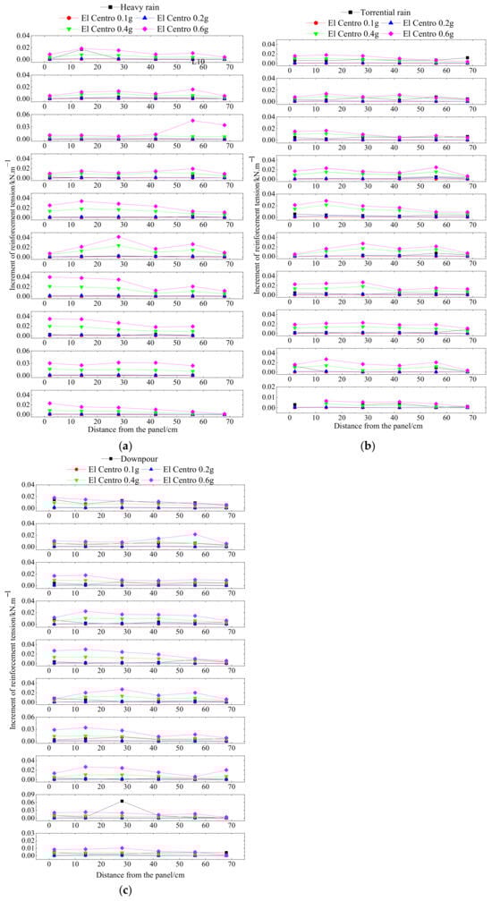 The distribution law of reinforcement tension is the key to designing reinforced soil structures. The tension of retaining wall reinforcement in three conditions is shown in Figure 14. It can be seen from the figure that the tension increments of the reinforcement increase with the acceleration in all conditions, and the tension increments of each layer of reinforcement vary nonlinearly with the wall height.