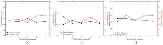 Distribution of natural frequency and damping ratio: (a) R1; (b) R2; (c) R3.
