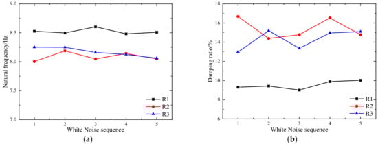 Comparison of natural frequency and damping ratio distribution: (a) comparison of natural frequency distribution; (b) summary comparison of damping ratio distribution.