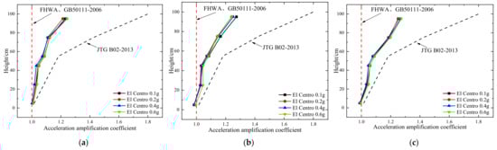 The RMS (root mean square) method is employed to process the acceleration time histories of various conditions, and the ratio of the RMS acceleration value at different heights inside the retaining wall to that at the table surface is defined as the acceleration amplification coefficient. The distribution patterns of the acceleration amplification coefficients along the wall height within the soil behind three groups of retaining walls are shown in Figure 17. Regarding Figure 17, the analysis will focus on the following two points: