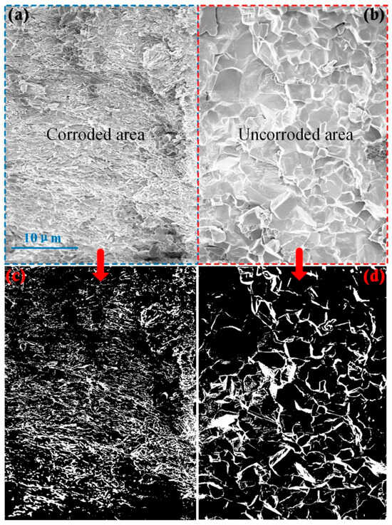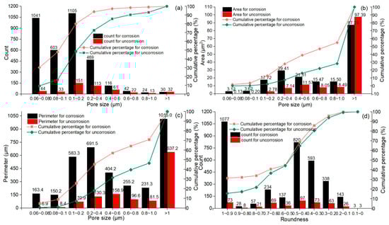 - In the analysis of pore characteristic parameters, the corroded concrete structure exhibits distinct characteristics. The corrosion process generates numerous pores inside the concrete, particularly micro and medium pores smaller than 0.4 μm, which appear as thin strips, needles, and nearly round shapes. This substantially increases the internal porosity and looseness of the concrete structure, leading to a reduction in its strength.