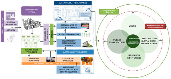 The methodology for the second part of the study is based on the philosophy of Living Labs [16,17]. This new concept of LL seeks to promote innovative processes where users become active actors and not just passive recipients, considering the relationship among the parties involved in order to bring together the four helixes of society: users, public actors, private actors, and knowledge institutes. LLs have been used in the past to facilitate the implementation of innovative building technologies [18] as genuine test beds to respond to the needs previously identified in the sustainable building standards through data collection and surveys [19,20,21]. In addition, they have also been applied to the development of an ecosystem for the detection of barriers and opportunities in the field of energy in buildings [22] or the application of sustainable building standards. All of this makes it a cooperative and consensual process that fits the needs of the present study.