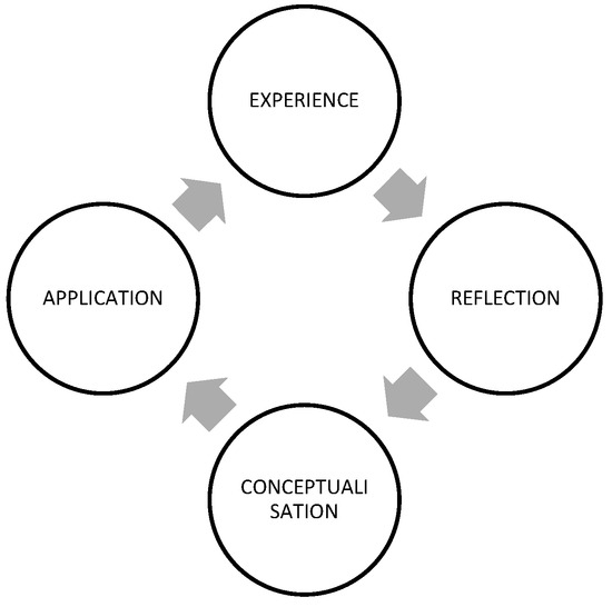 To achieve these objectives, a Living Labs School/Workshop was developed, aimed at local administration staff and agents in the construction chain. Here, a playful, experiential form of education was proposed in which participants take an active role in the learning process, applying gamification techniques that promote critical thinking in the group and empower them to action. This teaching–learning approach promotes a balance between affective (emotional), behavioural, and cognitive (knowledge-based) learning. Furthermore, learning is inductive, which means that participants come to their own conclusions about the experience and content of the Living Labs, making it easier for them to directly apply their learning to real-world situations and thus facilitating replication. To this end, the ERCA technique [25] (experience, reflection, conceptualisation, and application; represented in Figure 2) is applied, where these four stages are present in the design and deployment of the workshop and training school to complete the learning cycle within the Living Labs ecosystem of sustainable building.