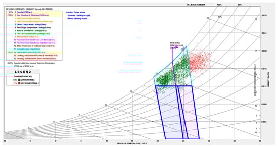 Annual comfort according to ASHRAE Standard 55 with applied comfort strategies.