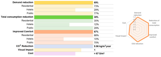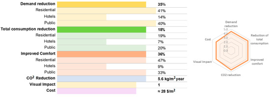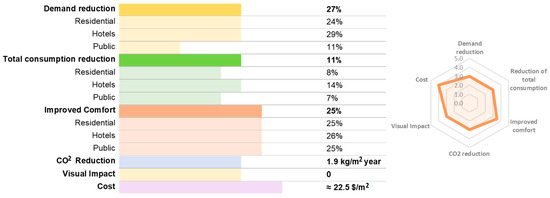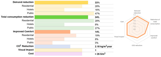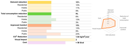 After verifying the impact of the application of the defined sustainable construction strategies and interventions, the suitability of each building typology was analysed. This was conducted based on an analysis of the impact produced by the application of each of the strategies on the different typologies, focused on the following aspects: energy savings, reduction of CO2 emissions, improvement of comfort, visual impact, and cost of implementation. In addition, the following were identified for each of the strategies or actions: (i) the building typologies on which it should be implemented, i.e., new construction and/or rehabilitation; (ii) characteristics, functionalities, and objectives of improvement of its application; (iii) schemes and sketches showing the concepts and effects of its application; (iv) materials and elements necessary for its implementation; (v) advantages and disadvantages of its application; (vi) aspects to take into account when implementing it; and (vii) aspects of the sustainability of its implementation.