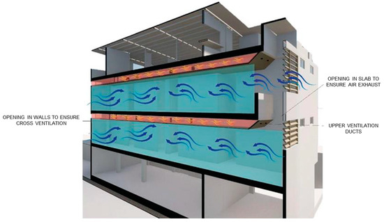 For the hotel, the availability of vacant rooms on each floor was leveraged to design a system that creates airflow within a duct running through the hotel corridor’s false ceiling (Figure 13). This system, with vents connecting the hotel rooms to the corridor, was intended to enhance natural ventilation in each area.