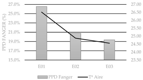 Figure 14 compares the comfort levels of three different cases for the hotel LL where E01 is the baseline case, E02 is the intervention case with natural ventilation through windows, and E03 is the intervention case with natural ventilation through windows with rooms connected to the corridor. The results show that the proposed ventilation solution outperforms the thermal comfort levels of the first intervention option, considerably improving the comfort levels of the base case.