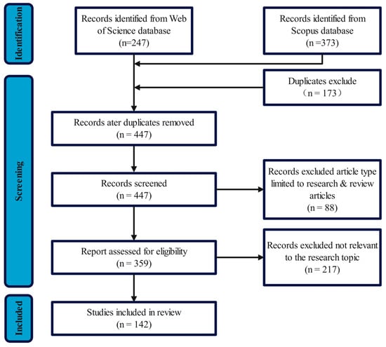 Based on the above criteria, 142 papers were retained for analysis. Figure 1 shows the flowchart of the literature search and screening process following the PRISMA statement.