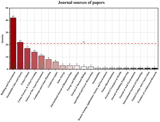 A total of 142 papers met the selection criteria and were included in the analysis. Figure 2 shows the journal source information of the papers, among which “Building and Environment” is the journal with the most papers published in this field, with a total of 42 papers; “Sustainable Cities and Society”, “Urban Climate”, “Urban Forestry & Urban Greening”, and “Science of The Total Environment” also have more than 10 papers.