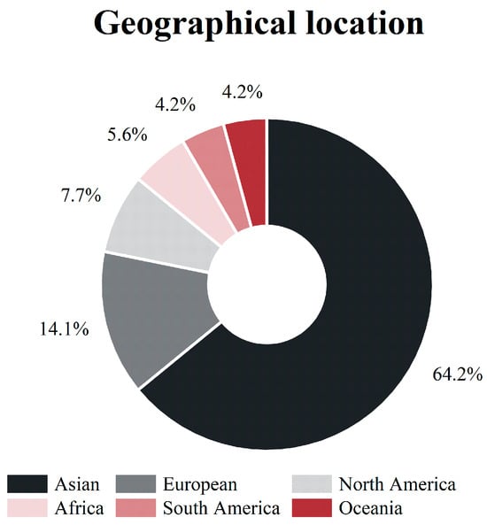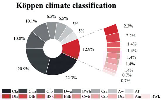 Figure 3 illustrates the regional distribution of research, with statistics limited to regions where primary research sites are located for standardization purposes. Asia is the most extensively studied region, accounting for over 60% of all studies, followed by Europe at just over 14%. Research areas are concentrated in mid-latitude regions of the Northern Hemisphere, primarily in developed countries and those experiencing rapid economic growth. Figure 4 shows the Köppen–Geiger classification for all studies, with Cfa, Cwa, Cfb, and Dwa being the most researched climate divisions, with a combined share of more than 64%.