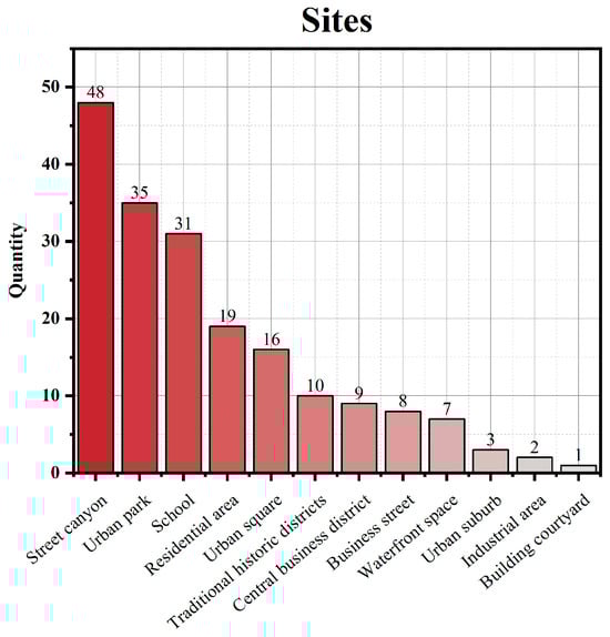 Figure 6 depicts the distribution of research locations selected for statistical papers. Street canyons emerge as the predominant choice among researchers (34%). Furthermore, city parks (25%), schools (22%), residential neighborhoods (13%), and city squares (11%) were also extensively favored by researchers.