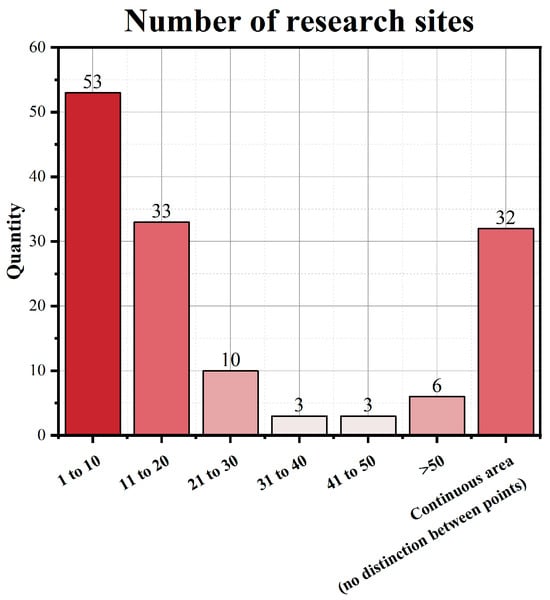 Figure 7 illustrates the distribution of the number of study sites. Due to limitations in the spatial and temporal spans of field measurements, 62% of the studies opted for fewer than 20 sites. However, with the rapid emergence of mobile measurements, more than 23% of the studies have shifted away from a limited number of fixed sites and now prefer obtaining continuous environmental information through mobile measurements.
