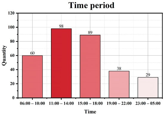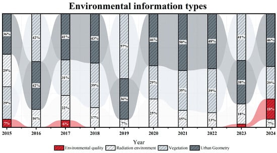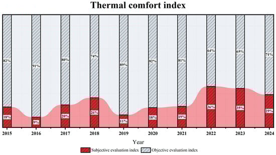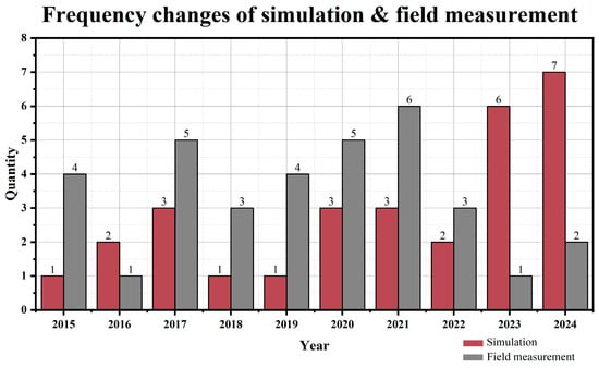 Figure 8 shows the frequencies of the study periods, highlighting midday to afternoon as the predominant period for thermal discomfort investigation (73%). Over 40% of the studies opted for a full day as their study duration to obtain a more comprehensive understanding of thermal comfort trends. Due to the cost and difficulty associated with field measurements, simulation-based approaches have gained popularity in these extended-duration investigations since 2023 (Figure 9).