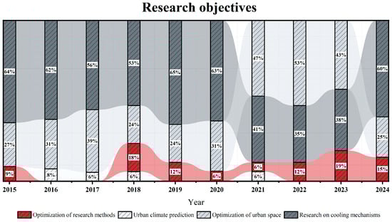 The distribution of research objectives for all papers is illustrated in Figure 10, where the dominant research objectives are cooling mechanisms and urban spatial optimization strategies (88%). Although many studies focused on a single research objective, more than 17% researched multiple objectives simultaneously. Furthermore, while only a limited number of studies have aimed at research method optimization, the share of studies with this aim has gradually increased in recent years.