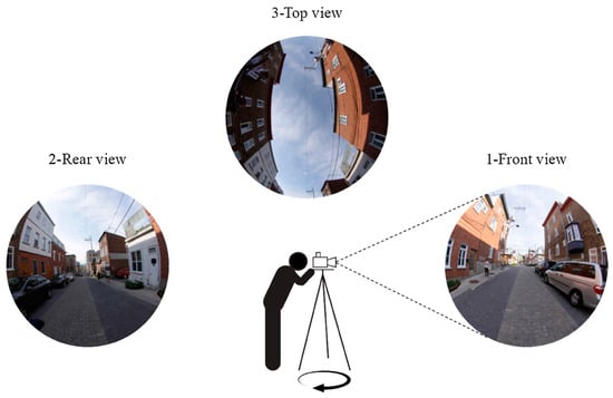 In the early stages, hemispherical photography for acquiring environmental information was predominantly conducted at fixed points using wide-angle lenses [16]. Subsequently, this method has been integrated with various advanced technologies, including infrared detection [17], LiDAR [18], Google Street View [19], drones [4], and simulation software [20].