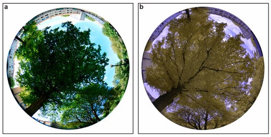 In recent years, to utilize the unique spectral response properties of photosynthetically active plant elements [30], researchers used the Blue IR filter (a filter introduced by Kolari Vision that transmits both blue light and infrared light for NDVI crop analysis applications) to replace the camera’s hot mirror to take dual-wavelength hemispherical photography to achieve effective acquisition of richer environmental information [31] (Figure 13). In general, the use of a fisheye lens to acquire hemispherical photography is more costly in terms of time and labor and usually can only obtain a small amount of fixed-point environmental information, which does not apply to the acquisition and description of composite information in a wide range of space [32].