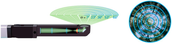 The plant canopy analyzer is an instrument utilized to investigate plant canopy structure and growth (Table 2). It serves as an effective tool to acquire information regarding the location, size, density, and distribution of gaps within the plant canopy [56]. Equipped with a fisheye lens and an optical system comprising five concentric ring detectors (Figure 14), its latest enhanced model, “LAI-2200C”, enables precise measurements under diverse sky conditions without necessitating specific sun angles or cloud cover conditions [57]. Although similar to hemispherical photography obtained through a fisheye lens, the plant canopy analyzer surpasses it in terms of automated data processing capabilities while minimizing errors associated with camera positioning, exposure, and skylight uniformity; however, this comprehensive system also entails higher costs.