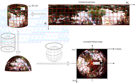 Schematic of the process of converting a Google Street View panorama from an isometric cylindrical projection to an isometric azimuthal projection [19].