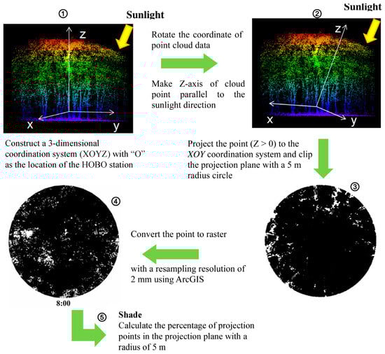 The 3DPC was processed to obtain the hemispherical projection using GIS software, and the scale of the canopy projection was calculated for a radius of 5 m [18].