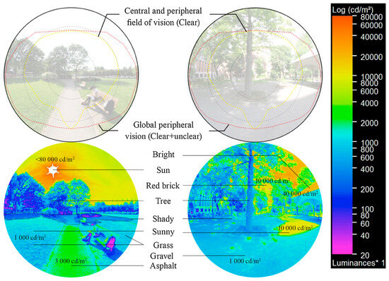 The images obtained through infrared detection techniques are commonly known as thermograms. This technique captures and visualizes the infrared radiant energy emitted by an object [28] (Table 3). In investigations of urban outdoor thermal environments, the radiative environment plays a crucial role in determining comfort levels [72]. In 2023, Middel et al. presented a thermographic panorama using a six-way hemispherical photography approach and constructed a hemispherical photograph utilizing the PanoMRT (Panoramic infrared thermography) model [17] (Figure 16). Due to its non-contact nature, thermal imaging is well-suited for assessing the micro-scale radiation environment in panoramic view mode. Merchant et al. [73] developed a camera system that records 360° shortwave and longwave panoramic images to address spatial variations in shortwave and longwave radiative heat transfer in outdoor environments. As a form of hemispherical photography that integrates multiple environmental information, infrared detection technology offers advantages such as reduced time consumption, high information density, and enhanced data accuracy when studying urban outdoor thermal radiation environments.