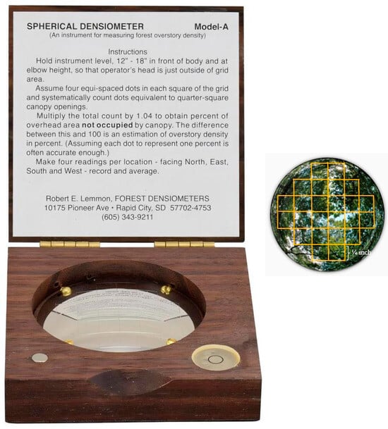 - Forest Densiometers Spherical Densiometer. Available online: https://www.forestdensiometer.com/about-the-densiometer (accessed on 9 May 2024).