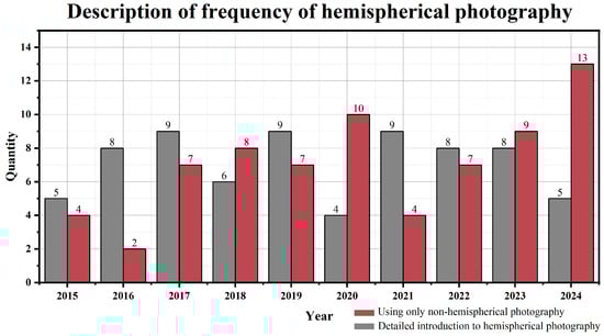 However, previous studies usually only regard hemispherical photography as an image-based intermediate result [23] and do not consider it as a relatively independent research method and tool for systematic investigation. The application of hemispherical photography in previous studies has been somewhat random, failing to fully leverage its advantages for more purposeful use by researchers. To address this issue and enhance the rationality of hemispherical photography applications in future research, this study selects hemispherical photography as the research object. By summarizing the utilization of hemispherical photography in OTC research over the past decade, this study explores the transformation of its application, aims to summarize its characteristics and future development trends, and seeks to provide a clearer and more reasonable methodology for researchers who apply hemispherical photography in OTC research.