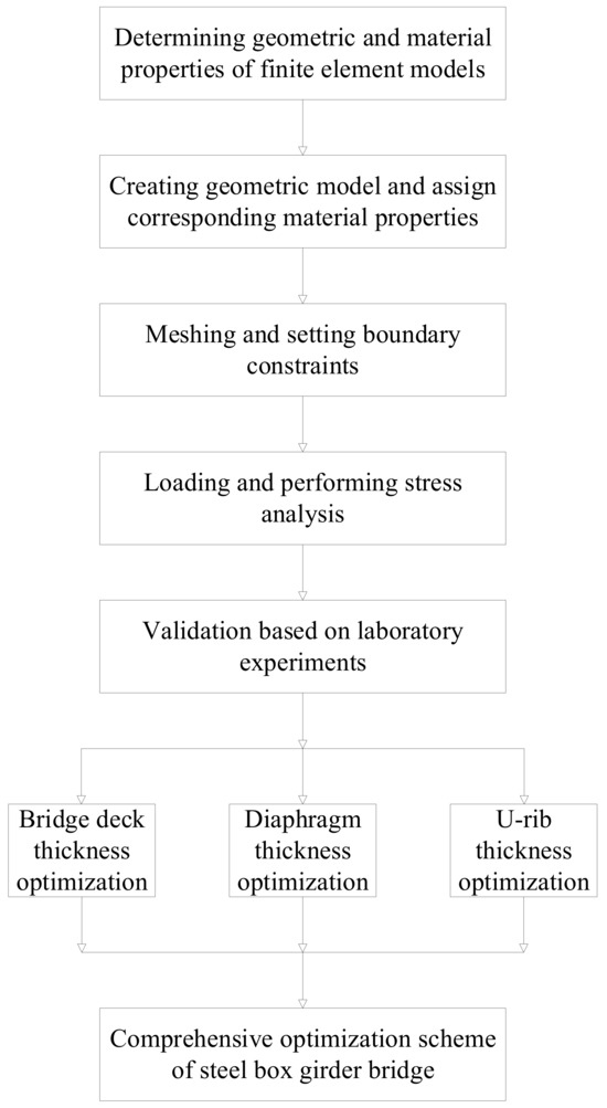 The purpose of this study is to optimize the design of multiple key components of a steel box girder bridge, which was built in Harbin, Heilongjiang Province, China. A finite element simulation was the main method used to improve efficiency and reduce costs. In addition, experiments are also necessary to verify the accuracy of the FEM. This study could be divided into 3 main steps: (1) Considering practicality, the computational cost, and the validation cost, build an FEM to simulate a real bridge. (2) Validate the established FEM based on a laboratory experiment. (3) Explore a comprehensive optimization scheme based on the validated FEM. The specific flowchart of this study is shown in Figure 1.
