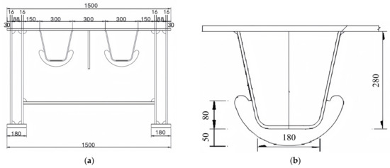 Dimensions of the model (mm): (a) Schematic diagram of cross-section; (b) Schematic diagram of local dimensions of U-rib and diaphragm.