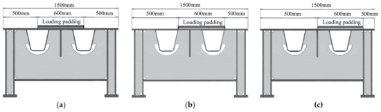 The way in which the boundary conditions are applied is important in a finite simulation analysis [34,35]. Specifically, the constraints on the left side of the model were set as U1 = U2 = UR2 = UR3 = 0, while the right side of the model was set to the full fixed constraint U1 = U2 = U3 = UR1 = UR2 = UR3 = 0. According to the “Regulations on the Management of Over-limit Transportation Vehicles Traveling on Highways”, the heaviest standard truck has a gross weight of about 48 tons, which is why we have determined the load to be 480 KN. Three kinds of loading conditions were considered (Figure 4).