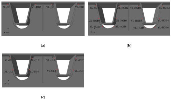 In practice, the FEM results usually need to be compared with the experiments [36,37]. In this study, the simulated and experimental values of the bridge deck stresses, diaphragm stresses, and U-rib stresses were collected and compared for each loading condition.